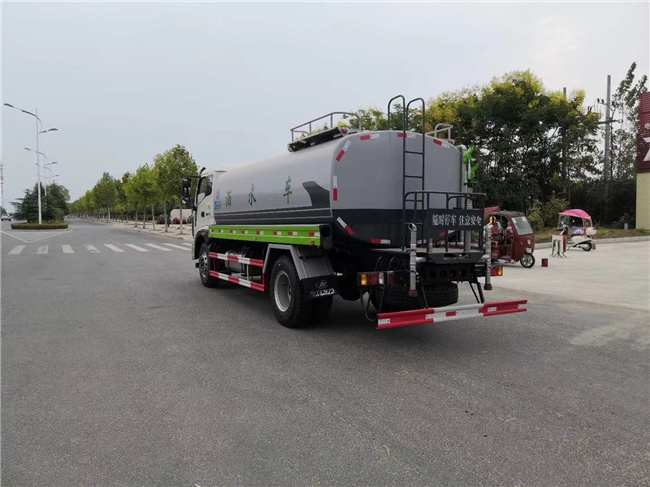 上裝配置:罐體采用4mmQ235優(yōu)質(zhì)碳鋼板制作,容積15立方,前沖(噴)后灑,帶側(cè)噴,罐體后帶工作平臺,平臺上安裝綠化灑水炮,灑水炮可旋轉(zhuǎn),可連續(xù)調(diào)成直沖狀、大雨、小雨、毛毛雨,帶安全護(hù)欄,配備億豐大功率專用自自排灑水泵,安裝過濾網(wǎng),帶消防接口,可通過消防栓進(jìn)水,帶自流閥,罐體金屬漆。